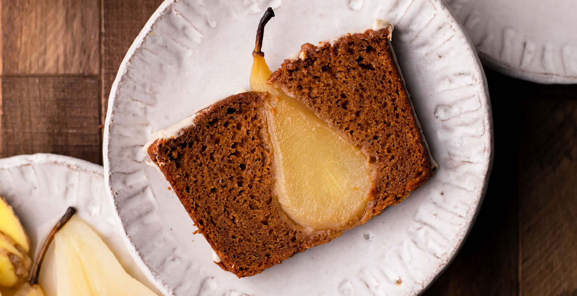 Place the poached pears into the batter in the loaf pan so that the stems are upright. Place in oven and bake for 40 to 50 minutes, or until a toothpick tester comes out clean and the cake is pulling off the edges of the pan.